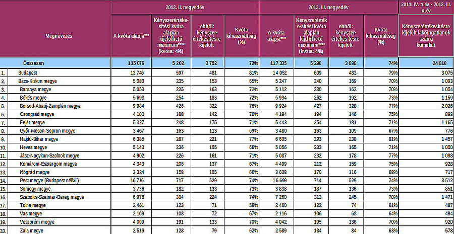 Amennyiben a kvóták kihasználtságát nézzük, úgy Hajdú-Bihar megye vezet 81 százalékkal, őt a 79 százalékos Budapest követi, míg a képzeletbeli dobogóra Szabolcs-Szatmár-Bereg fért fel még 78 százalékkal. A lista másik végén a 61 százalékos Tolnát találjuk, aki Zala (63 százalék) és Vas megye követ (64 százalék).