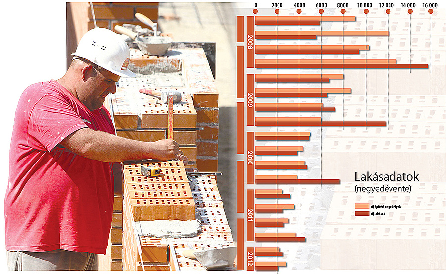 Nem tudjuk fékezni a lakásállományban megtestesülő nemzeti vagyon értékvesztését, s ha a második félévben folytatódik a trend, akkor mind az építési engedélyek, mind a kész lakások száma tízezer körül lesz, ami példa nélküli a magyar lakásstatisztikában és a negyede a szükségesnek − véli Varga Dénes kutató, a DEM Információs és Gazdaságkutató Iroda vezetője. A cég előrejelzése 1994 óta most a legpesszimistább, s úgy látja, hogy sem a kormánypártoknak, sem az ellenzéknek nincs olyan gazdaság- és lakáspolitikai elképzelése, amely alkalmas volna a jelenlegi negatív tendenciák megfordítására. Valószínű, hogy 2015-ig az építési volumen nem haladja meg az évi 20 ezer lakást, ennyit a stagnáló gazdaság és a nulla hatékonyságú lakáspolitika mellett is eltart a kereslet, ha közben valamennyi lakáscélú megtakarítás felhalmozódik. Varga szerint jelenleg a lakáspolitikát az építőanyag-gyártók koncepcióját átvevő Új Széchenyi terv − amelynek középpontjában a tömeges bérlakásépítés pazarló programjának erőltetése áll − jelenti, csakhogy az a mostani helyzetben szerencsére megvalósíthatatlan, így olyan jelentéktelen súlyú rögtönzések futnak, mint az ócsai projekt. Szimbolikusnak tartja az otthonteremtési támogatás visszaállítását, amelynél egy rendkívül szakszerűnek tűnő, részletes, bonyolult, de teljesen értelmetlen szabályozás született.