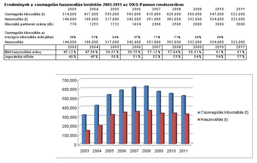 2008-ig minden évben növekedett a szelektíven gyűjtött csomagolási hulladék mennyisége, ezt követően - a válság miatti általános gazdasági visszaesés következtében - némi csökkenés mutatkozott. Igaz, a kibocsátott csomagolás a csökkenő fogyasztás miatt szintén csökkent. 2008-ban az ÖKO-Pannon rendszerében mintegy 362 ezer tonna csomagolási eredetű hulladékot gyűjtöttek be szelektíven, 2009-re ez 332 ezer tonnára esett vissza. 2011-ben az országos csomagolás hasznosítás 540 ezer tonna körül alakult, ez körülbelül 60 százaléka az országos csomagolás kibocsátásnak. Ennek a mennyiségnek azonban csak mintegy 16 százalékát teszi ki a lakossági begyűjtés, a fennmaradó részt ipari, kereskedelmi forrásokból gyűjtötték be. A háztartásban keletkező szilárd hulladék (minden hulladékfajta, például elektronikai hulladék, zöldhulladék, építési törmelék, nem csak csomagolás) körülbelül 10 százaléka kerül szelektíven begyűjtésre és hasznosításra.