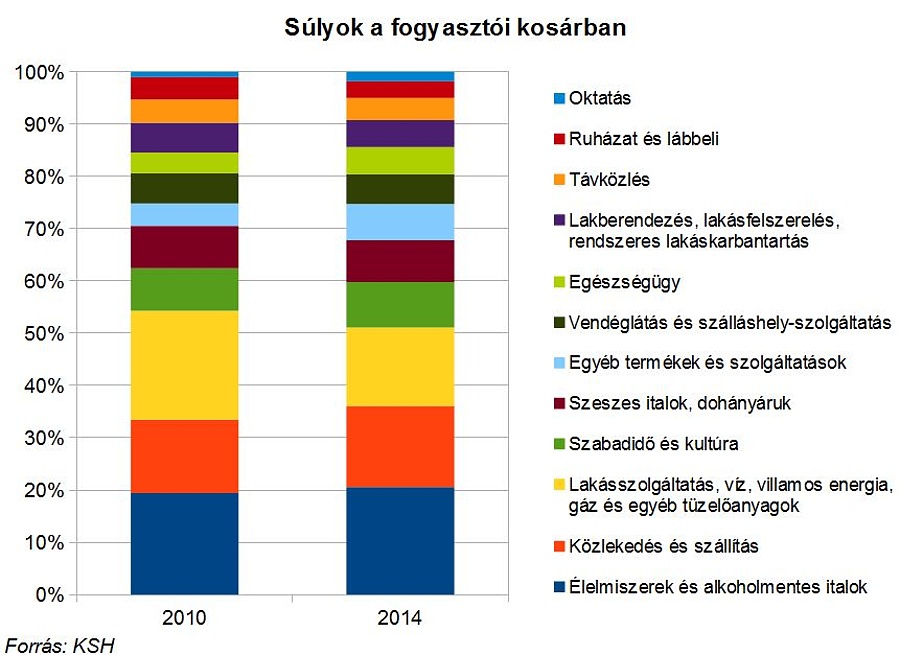 A fenti ábrához kapcsolódó érdekesség, hogy 2010-hez képest a szeszes italok és dohányáruk együttes csoportjának súlya érdemben nem változott, de ezen belül átrendeződés történt: az alkohol aránya csökkent, a dohányé nőtt.