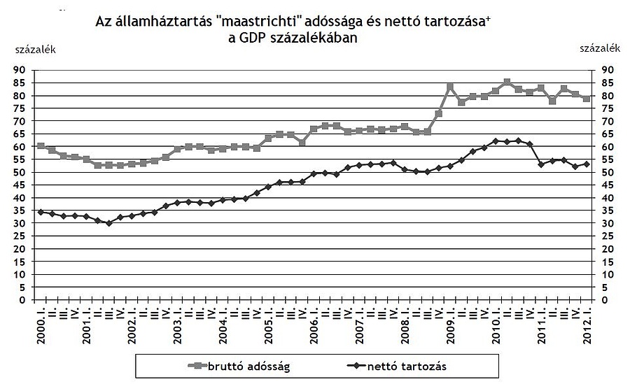 Az államháztartás bruttó, konszolidált, névértéken számításba vett (maastrichti) adóssága 2012 első negyedévének végén a GDP 78,9 százaléka volt (22397 milliárd forint), míg a nettó tartozás 15112 milliárd forintot tett ki, ami a GDP 53,2 százalékának felel meg. Az adósságot az első negyedévben 231 milliárd forinttal növelte a nettó hitelfelvétel (tranzakció), és 526 milliárd forinttal csökkentette a forint erősödése (átértékelődés).