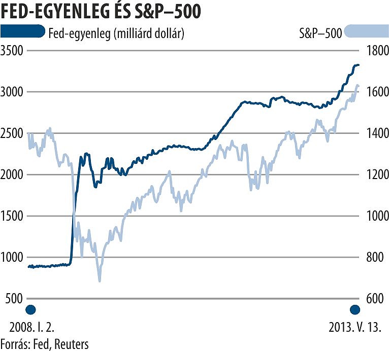 Megfigyelők szerint az Egyesült Államok jegybankjának szerepét betöltő Federal Reserve egymaga felelős a világszerte csúcsokat ostromló részvényindexekért. A Fed nyolc hónapja kezdte meg a havi 85 milliárd dollár eszközvásárlást jelölő QE3 programot, azóta tehát 680 milliárd dollár értékben vásárolt amerikai államkötvényeket és jelzálogleveleket. Ez idő alatt az S&P−500 14 százalékos, a Dow Jones ipari átlaga pedig 12,5 százalékos emelkedéssel hágott új történelmi csúcsra. Tegnap a piacon arról pletykáltak, hogy az amerikai makromutatók további javulása esetén akár már az idén visszavehetnek majd az − eredetileg jóval hosszabb életűnek gondolt − QE3-ból, ami érezhető bizonytalanságot okozott a kereskedésben. A program hatásának megítélésében azonban nincs konszenzus, és ez megsokszorozhatja a leállítással kapcsolatos kockázatokat is.
