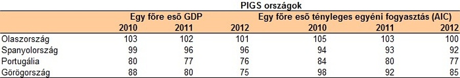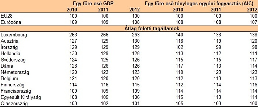 Az egy főre eső vásárlőegységen kifejezett AIC a 28 tagállam esetében 28 és 138 százalék között szóródott 2012-ben. A legjobb érték itt is Luxembourgé, míg a legrosszabb Bulgáriáé és Romániáé.