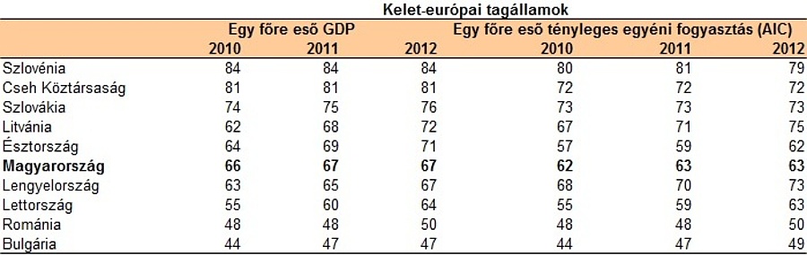 Magyarországon a vásárlóerő-egységben számított, egy főre jutó GDP az EU átlagának 67 százaléka volt tavaly, míg az egy főre eső tényleges egyéni fogyasztás 63 százalékon állt. Mindkét érték megegyezik a 2011-es szinttel.