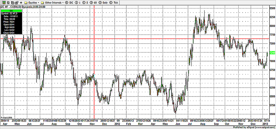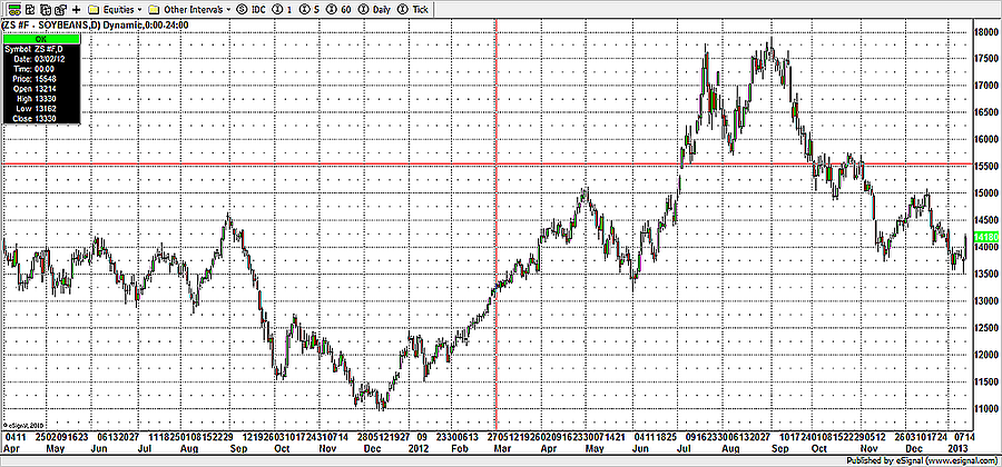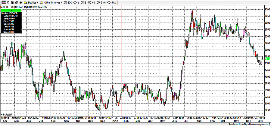 A tavalyi év érdekessége volt azonban, hogy az év közepén bekövetkezett szárazságnak köszönhetően ettől sokkal nagyobb visszaesést jósoltak a gazdák a tavalyi évre. Így történhetett, hogy a 2012-es csúcsértékeket a gabonák már a nyár közepén, illetve legvégén elérték. Onnantól kezdve, ahogy javult a helyzet, úgy mérséklődött az árfolyam mindhárom terménynél.