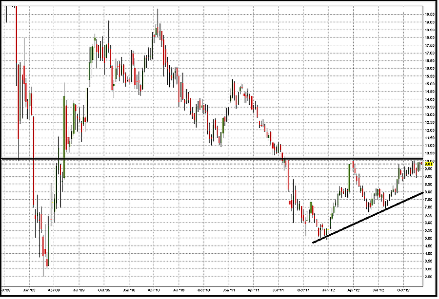 Köztudott, hogy a 2008-as válság óta a pénzügyi szektor iránti bizalom már nem a régi. A charton is jól látszik a recesszió vége, majd az utána következő fellendülés. 2010-es áprilisi új csúcs után, egy időben az amerikai, és európai makrogazdasági rossz adatok hatására, a Bank of America papírjának értéke tizenkilenc és fél dollárról csaknem 5 dollárra esett vissza. Az ezt követő egy évben egészen mostanáig a kérdés az volt, hogy sikerül-e az árfolyamnak ismét 10 dollár fölé kerülni?
