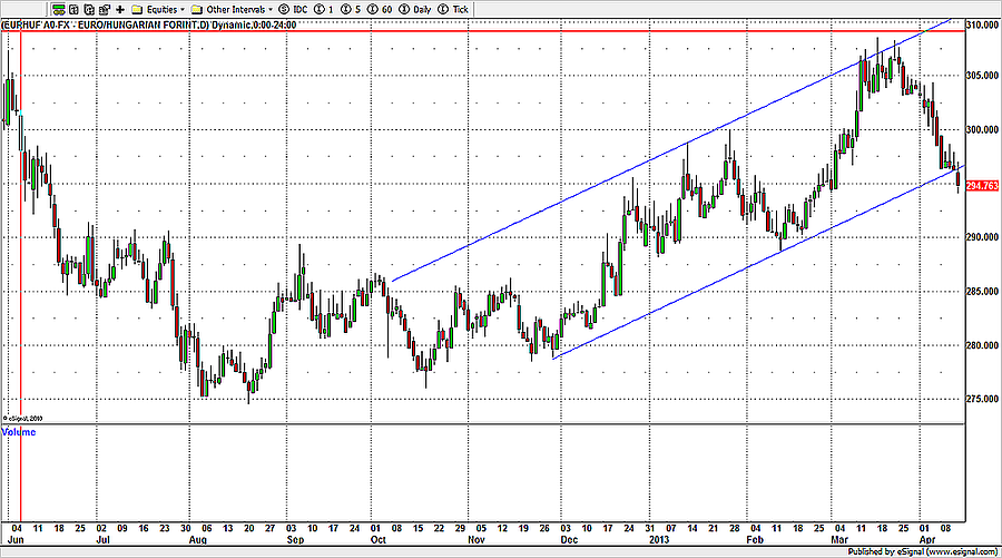 A 293 környékén meghúzódó 100 napos mozgó átlag jelentheti a következő megállót az EUR/HUF árfolyamában, ahonnan viszont már kevésbé vehemens erősödésre lehet számítani az MNB további, akár 100-150 bázispontos kamatvágása, valamint egy esetleges nemzetközi piaci hangulatromlás bekövetkezte esetén. Az előbbi ok azért akaszthatja meg a további jelentős forinterősödést, mert lassan eljöhet az a pillanat, amikor már nem lesz elég vonzó a hozam a külföldi befektetők számára, a piac hangulatromláshoz pedig elég lehet annyi is, hogy egy újabb eurozónás tagország felől jelenjenek meg aggasztó hírek (pl. Szlovénia).