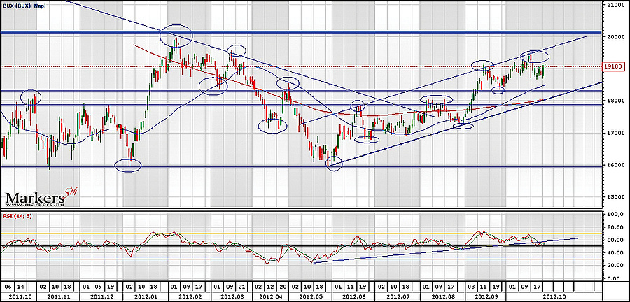 Október közepén a BUX index egyszerre közelítette meg a március közepi kisebb csúcs és a május óta tartó emelkedéshez tartozó emelkedő trendcsatorna tetejét, mindezt egy jó kis RSI-divergencia mellett, s ezt a kettős kihívást már nem bírta az index, korrekció vette kezdetét. Ugyanakkor a korrekció mértéke az OTP-ben bekövetkezett, 10 százalékot meghaladó átmeneti zuhanás ellenére az első komolyabb támaszszintet sem érte el, ezt a 18 300 pont közelében található szeptemberi lokális minimum jelentette volna. A trend tehát a pihenő ellenére maradt emelkedő, a mozgóátlagok felfelé mutatnak, az emelkedő trendcsatorna életben van, s folyamatosan magasabb csúcsok és mélypontok jelennek meg a grafikonon. Ráadásul a mutatóban korábban kialakult egy emelkedő háromszög alakzat, amelynek elsődleges célja ugyan már teljesült, azonban másodlagos célja 19 800−20 000 pont magasságában még nem. Ha folytatódna a felfelé menetel, akkor várhatóan 19 600 és 20 000 pont közötti találna ismét erősebb ellenállást az index. Lefelé a már említett 18 300 pontos szint lehetne az első támasz − 200 ponttal az 50 napos mozgóátlag alatt −, majd 18 000 pont magasságában a korábban említett háromszög egyik befogója. Az egyetlen figyelmeztető jelzést egyelőre az RSI mutató adta, amelyben a mostani korrekció hatására letört a május óta tartó emelkedő trendvonal. Ez a trendforduló első, de korántsem teljesen megbízható jele szokott lenni egy-egy árfolyamban.