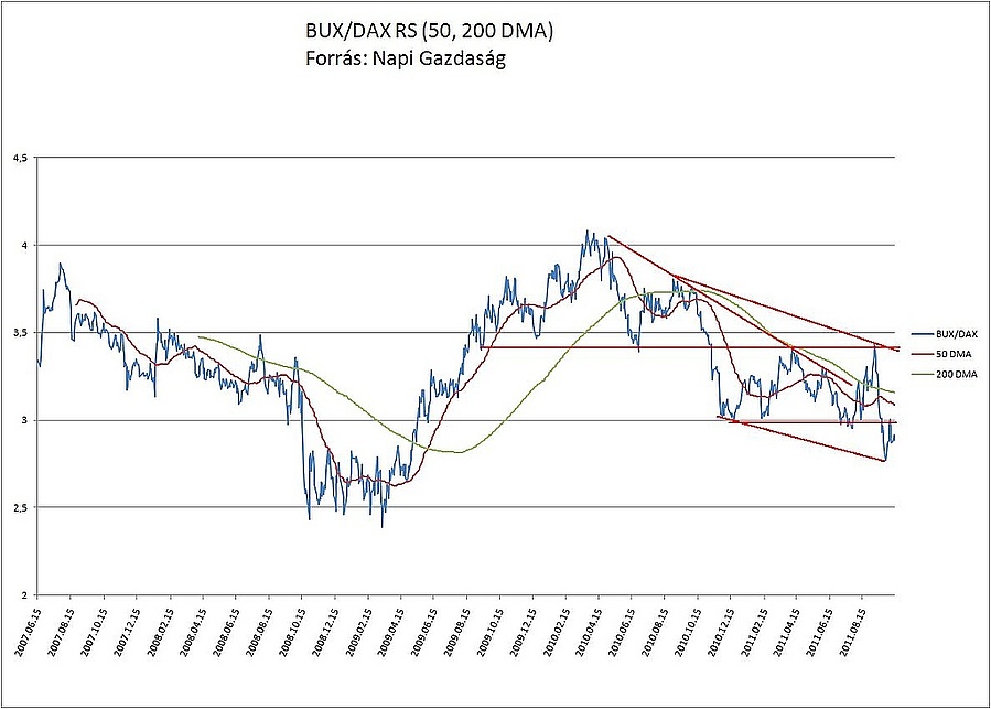A decemberi mélypontot követően indultak ugyan trenddel szembeni rallyk a mutatóban, például a Széll Kálmán Terv bejelentését követő általános optimizmusban, azonban ezek csak arra voltak elegendőek, hogy a letört formáció nyakvonaláig hozzák föl a BUX/DAX RS-ét, pozitív trendfordulat nem következett. A mutatóban klasszikus sávozó mozgás alakult ki, az utolsó, sáv széléig tartó emelkedés nem is a magyar piac jó teljesítményének volt köszönhető, hanem annak, hogy a DAX rövid idő alatt akkorát esett, amit a magyar részvények nem voltak képesek követni. A sáv végül szokásához híven trendfolytató alakzatnak bizonyult letört és ez első körben a mutatót olyan alacsony szintre küldte, amelyre legutóbb 2009 tavaszán volt példa.