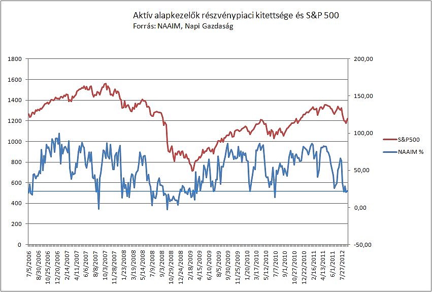 Az aktív alapkezelők míg az S&P 500-as index 1100-1150 közötti tartományban tartózkodott elkezdték feltölteni long irányú pozícióikat, azonban 1200 pont felett ismét eladásokba kezdtek. Szövetségük, az NAAIM felmérése szerint a nettó long pozíciók aránya 22 százalékra csökkent-Ez azt mutatja, nem bíznak abban, a mostani emelkedés tartós lehet. A mostani érték egyébként elég alacsony szám, azonban nem érte el a nulla alatti szintet, igazi piaci mélypontok környékén ilyen helyzet is elő szokott állni. Ilyen hosszan, immár hatodik hete 40 százalék alatti értékre egyébként szintén nem volt még példa 2009 tavasza óta.