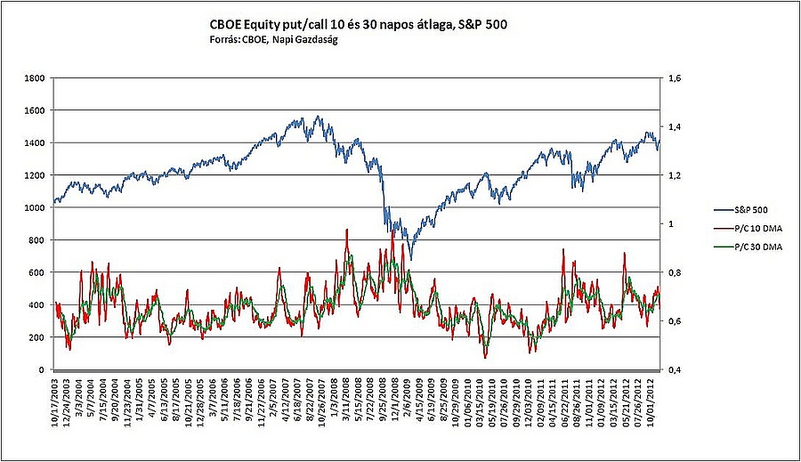 A Chicago Board Options Exchange-en az eladott eladási és vételi opciók egymáshoz viszonyított arányát mutató put/call hányados sem tartózkodik egyik irányban sem olyan régióban, ami szélsőségesnek lenne tekinthető.