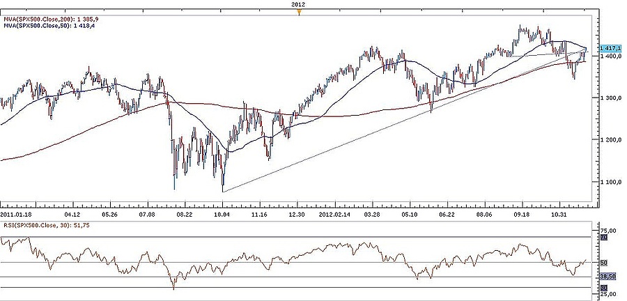 Az S&P 500-as index eközben a héten folytatta óvatos felfelé menetelését, a korábban letört fej-vállak alakzat nyakvonala a korábban letört emelkedő trendvonala együtt ugyan erős ellenállást jelentett az indexben - több mint 20 pontot zuhant innen az index értéke átmenetileg - azonban a korrekció gyorsan lezajlott, s a jelek szerint most az 50 napos mozgóátlag meghódításával kísérletezhet a mutató. A felfelé menetet mindenesetre a hangulati beállítottság és a pozicionáltság várhatóan nem fogja gátolni. Persze hozzá kell tenni, hogy a két hete elért lokális mélypontról megdöbbentő sebességgel emelkedett az index értéke, gyakorlatilag jelentősebb megállás nélkül.