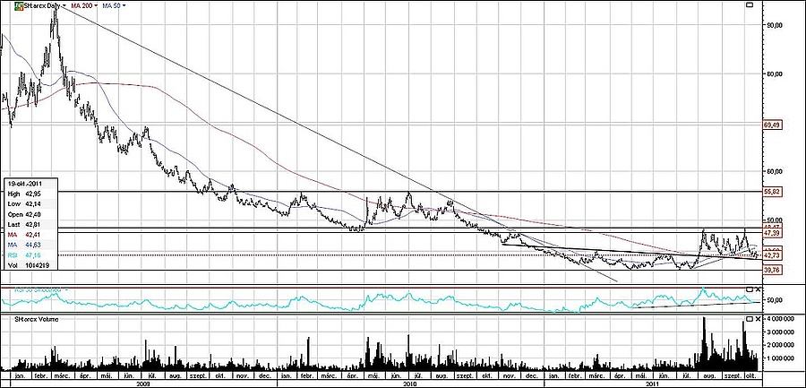 Eközben kedden és szerdán nem csak az S&P 500-as index érintette 200 napos exponenciális mozgóátlagát, de az index csökkenéséből profitáló, nagy népszerűségnek örvendő SH nevű ETF is technikailag fontos szinthez érkezett. Tesztelte 42 dollár magasságában az év eleje óta kiépített fej-vállak alakzat augusztusban áttört nyakvonalát, miközben az árfolyamhoz tartozó RSI emelkedő trendvonalához ért. Így a következő napok áralakulása elég nagy jelentőséggel bír abból a szempontból, hogy a két hete indult emelkedés véget is vet-e a tavasszal indult medvepiacnak, vagy pedig csak egy ilyenkor szokásos, medvepiaci rallyval van-e dolgunk.